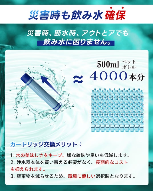 水に含まれる細菌、寄生虫、大腸菌、浮遊物などの直径0.01umまでの有害物質を効果的にろ過99.9999%除去率 2000ml濾過量★カートリッジ交換可能でプラスチック廃棄物を削減し、よりエコ!