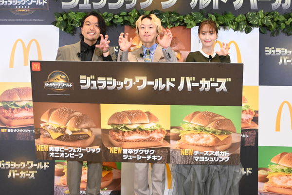 発表会では、お笑いコンビ「見取り図」の盛山晋太郎さん、リリーさん、さらにジュラシックシリーズ好きである女優の菅井友香さんが登壇。試食の際には、リリーさんのバーガーを盛山さんが肉食恐竜のような獰猛な動きで盗み食いする一幕も。