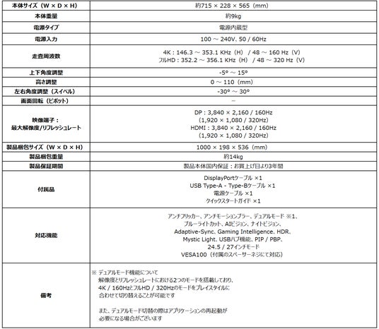 ゲームジャンルに応じて「4K 160Hz」と「フルHD 320Hz」の2つのモードを自由に切替可能