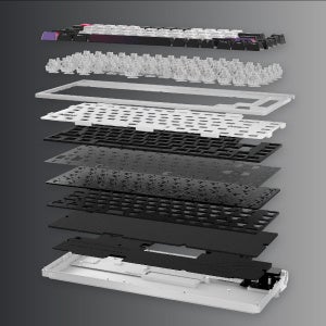 CNC削り出しのアルミ製トップカバーにPORONガスケット、FR4ポジショニングプレート、PORONプレートフォーム、PORONスイッチパッド、2層PORONダンピングフォームを使い快適な打鍵性と打鍵音を実現。