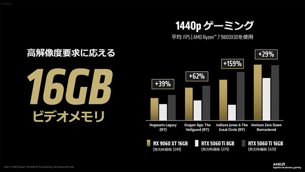 Radeon RX 9060 XT 16GBはGeForce RTX 5060 Tiよりも安価なので、単価あたりのパフォーマンスに優れるという