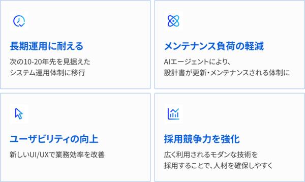 見込まれる効果としては、長期運用への対応やメンテナンス性の向上、UI/UXの刷新によるユーザビリティ向上などが挙げられている。