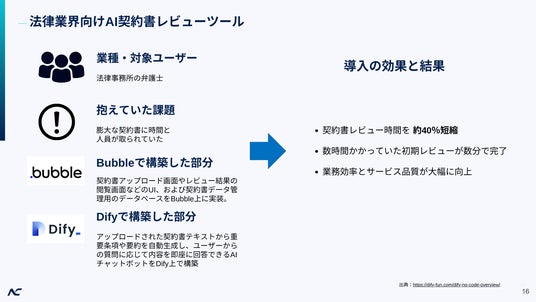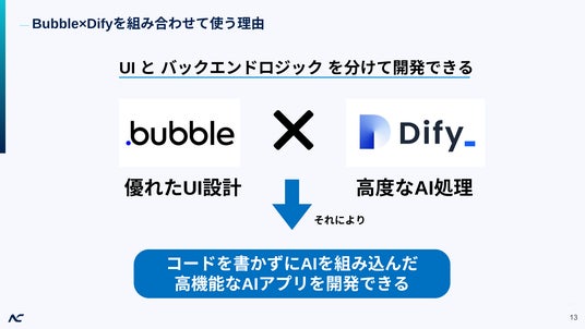 株式会社ノーコード総合研究所は、UI 部分をノーコードツール「Bubble」、AI ロジックを「Dify」で構築する開発フローでサービスを提供します。