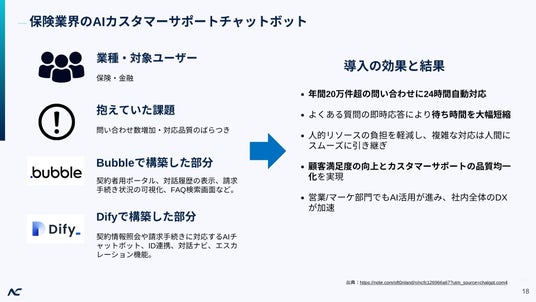 開発期間と費用を抑えつつAI搭載プロダクトを素早く公開でき、企業にとっては、顧客対応の品質向上と業務効率化が期待されます。今後はBubble×Difyを活用したAIプロダクトの受託開発を通じて、国内企業の業務改革と生産性向上に貢献してまいります。
