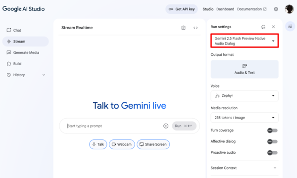現在利用できるのは下記の3モデル。通常はデフォルトのGemini 2.5 Flash Preview Native Audio Dialogを選んでおけばよい。