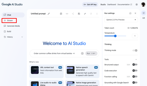 では実際に使ってみよう。Google AI Studioにログインし、左側サイドメニューから通常の「Chat」ではなく「Stream」をクリック。