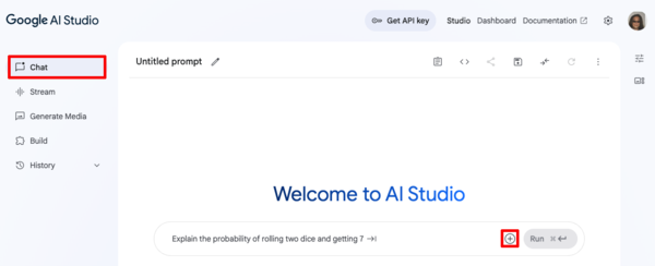 まずは左側サイドメニューからChatを選び、プロンプトウィンドウの右端の「+」をクリックしてあらかじめダウンロードしておいたPDFをアップロードしよう。