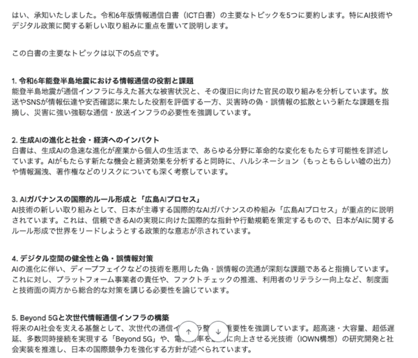 プロンプト:この情報通信白書の主要なトピックを5つ挙げ、それぞれ3行程度で要約してください。特に、AI技術やデジタル政策に関する新しい取り組みがあれば重点的に説明してください。