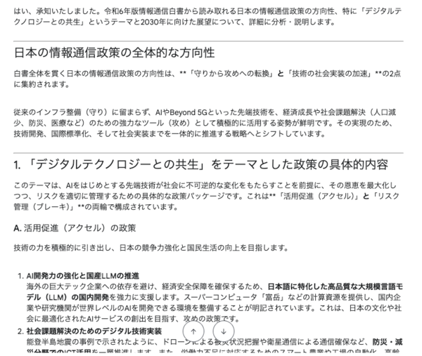 資料を元にさらに深い分析を依頼することも可能だ。単純な要約や情報抽出にとどまらず、文書全体の内容を踏まえた政策分析や将来展望の考察まで対応できる。