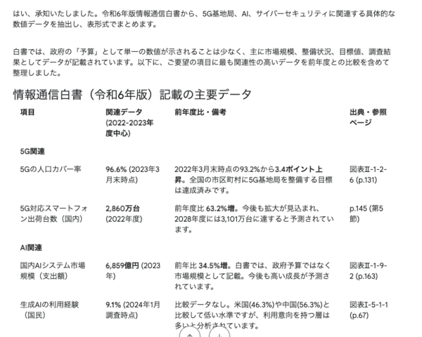 プロンプト:日本の5G基地局数、AI関連予算、サイバーセキュリティ対策費など、この白書に記載されている具体的な数値データを表形式でまとめてください。可能であれば前年度との比較も含めて整理してください。