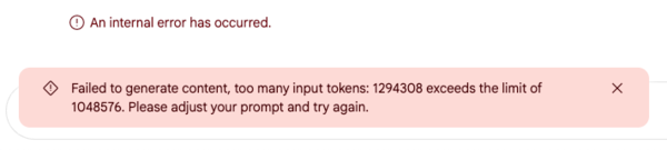 たとえば総務省統計局が公開している「日本統計年鑑(2025)」のPDFファイルは800ページ、30数MBと条件を満たしているように思えるが、実際は文字数(トークン数)が120万トークンと上限を越えてしまったため解析ができなかった。