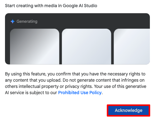 初回アップロード時に警告が表示されることがある。「他人の著作権やプライバシーを侵害するような生成」を禁止する旨の警告なので「Acknowledge(理解した)」をクリックしておこう。
