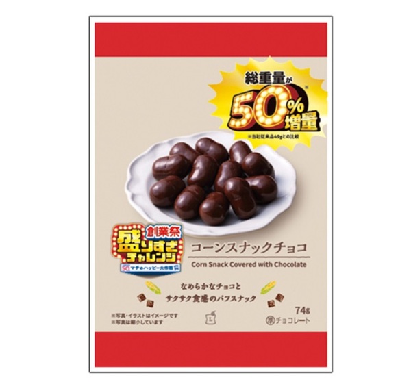従来品「コーンスナックチョコ 49g」と比較して、総重量を約50%増やした。なめらかなチョコでサクサク食感のパフスナックを包んだ。