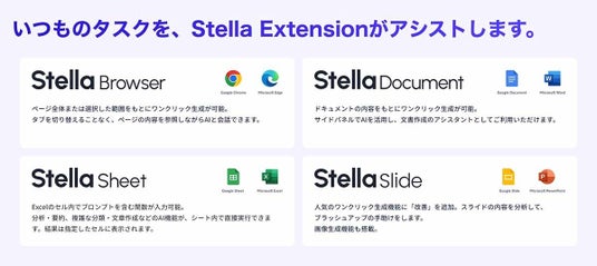 ※2:「Stella Extension for Biz」は、ブラウザやMicrosoft Office製品の拡張機能を設定いただくことでご利用いただける拡張機能です。Stella AI for Bizアカウントでログインいただき、追加料金なしでご利用いただけます。(詳細:https://biz.lp.stella-ai.net/extension/)、GoogleWorkspaceのStella Extensionは近日提供予定です。