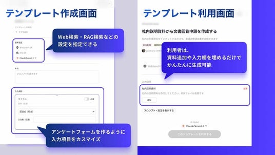 テンプレートはアンケートフォームのように簡単に作成できるため、AIに関する知識や技術がなくても高品質な結果を得られ、AIを業務に手軽に活用できます。
