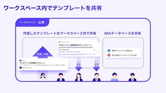組織やチーム単位でワークスペースを作成し、業務に特化した「テンプレート」や「RAG」※4を作成・共有することができます。作成したものは、ワークスペース内や特定のメンバーに共有することで、組織全体のノウハウとして蓄積可能です。