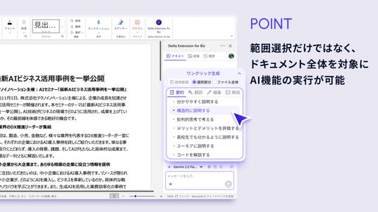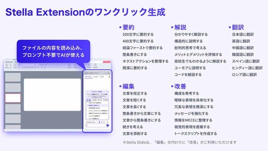 プロンプトを入力せずに要約・翻訳・解説・編集などのアクションを利用できる機能です。例えば、「Stella Document」では、WordもしくはGoogleドキュメント内で文章や記事の作成ができるだけでなく、選択した任意の部分やドキュメント全体をAIで解析し、ワンクリック生成を利用することができます。ブラウザでは「Stella Browser」、PowerPointでは「Stella Slide」で、ワンクリック生成がご利用いただけます。