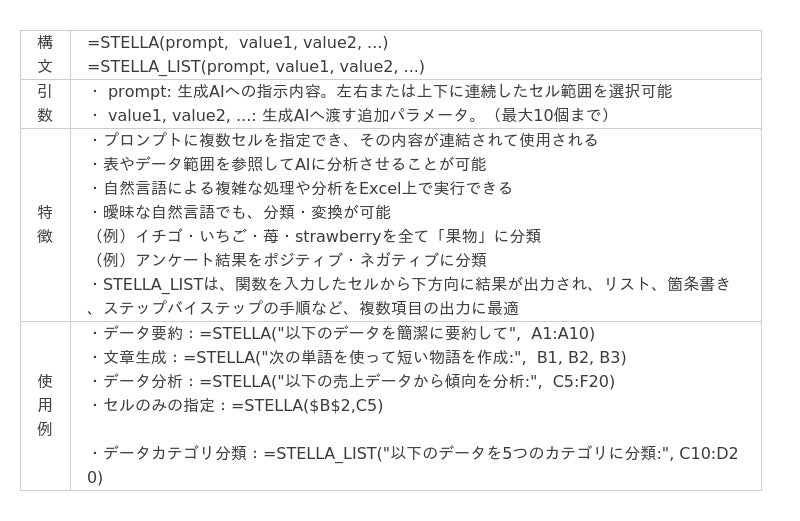 「STELLA関数」は、Excel内から直接生成AIを呼び出し、プロンプトとパラメータを基にAIにリクエストを送信、結果をセルに表示する拡張関数です。複雑なデータ処理や創造的なコンテンツ生成をExcelの作業フローにシームレスに統合できます。「STELLA_LIST関数」は、結果を単一セルではなく複数セルに分割して表示します。特にリスト形式のデータを生成する際に最適です。