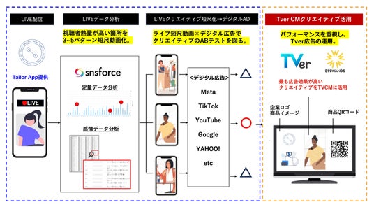 「snsforce」を用いてライブ動画を分析し、視聴者の熱量が高い瞬間を切り取ることで、「バズる」広告クリエイティブを制作します。これらをABテストを兼ねて各デジタル広告に配信し、PDCAサイクルを回します。