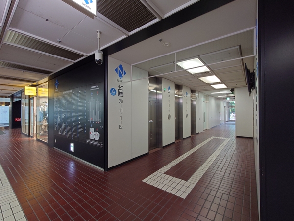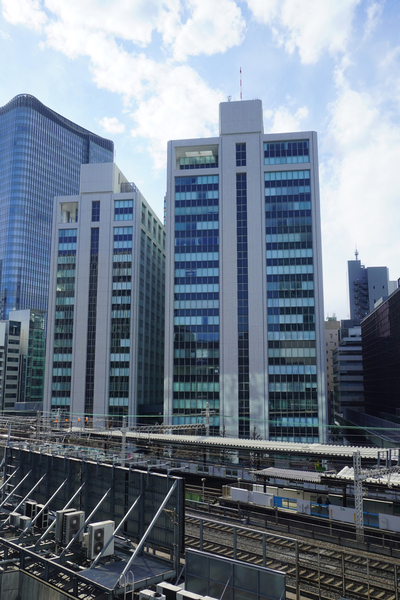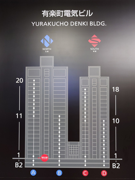 有楽町電気ビルヂングは、JR有楽町駅の南西側に建つ地上20階、地下2階、高さ87.0mの「北館」と地上18階、地下4階、高さ79.5mの「南館」から構成される超高層ツインビルです。北館・南館ともに柱部分を白色としたタイル張りの外装に、梁部分を暗色系、垂直水平のマリオンで窓ガラスを区切ったデザインとなっています。また、北館と南館が低層部分で接続しているほか、地下と地上1階には商業施設も入り、コンビニやレストラン、カフェ、物販なども入る複合ビルとして機能しています。東側の有楽町駅側には赤茶色のタイルに白いタイルで長方形が多数描かれた広場があり、広場の北東側には有楽稲荷神社も再配置されています。また、地下には126台収容の駐車場「有楽町電気ビルガレージ」もあります。1期竣工から50年が経過した古参ビルですが、高さ60m超の超高層ビルということもあり、まだまだそれほど古さは感じません。