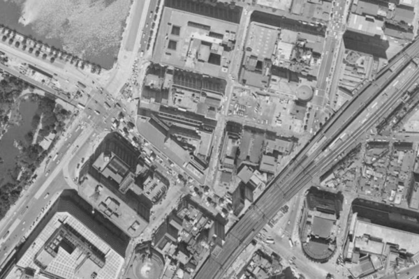 戦後、昭和の高度経済成長期に突入した有楽町駅南西側(南側を晴海通り、西側を丸の内仲通り、北側を丸の内 7th St.に囲まれた一帯)には、北西側に「電気俱楽部会館」、南西側に「電気協会会館」、北東側に「有楽稲荷神社」が位置していました。また、街区の北側にある電気協会所有地の一部には、戦後の混乱期に不法占拠されてできた飲食店が軒を連ねる横丁「スバル街」が広がっていました。スバル街は、近くに建っていた有楽町スバル座に因んだもので、有楽町駅を挟んだ東側の「すし屋横丁」と並んで有楽町の横丁として栄えていました。なお、不法占拠であったため、1955年頃から電気協会により立ち退き交渉が進められていました。そして1960年後半までには日本電気協会、電気倶楽部、富士アイス、明治生命保険、東宝、東光建物、国際自動車、東京都交通局の8地権者が土地を所有する状態となり、1966年には電気協会が進めていた立ち退き交渉にも目途が立ちます。3年間の立ち退き猶予期間が設けられたほか、その3年間は地代家賃ともに無料という条件によって和解し、電気協会は三菱地所に対して、ビル建設の協力依頼を行います。電気協会によるスバル街の立ち退き交渉は、1968年8月に成立し、ビル建設の計画が進められました。