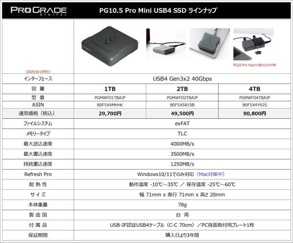 プログレードデジタルは、最新の小型SSD「PG10.5 Pro Mini USB4 SSD」を発売した。1TB、2TB、4TBの容量から選べ、価格はそれぞれ29,700円、49,500円、90,800円。
