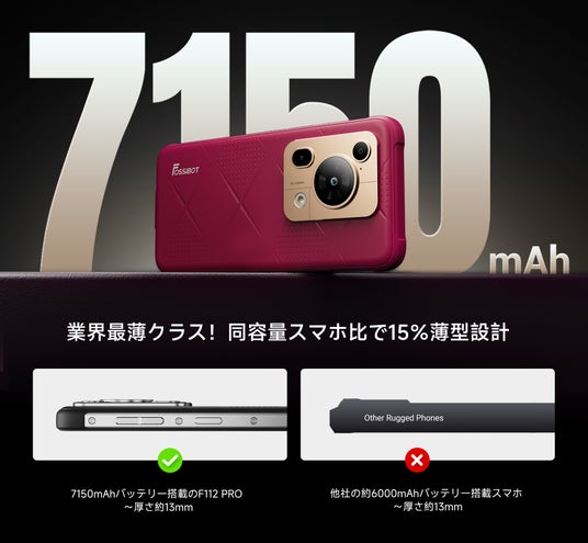 F112 Proは、7150mAhの超大容量バッテリーを搭載し、一般的なスマートフォンよりも圧倒的に長いバッテリー持ちを実現しています。