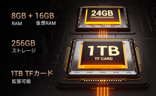 最大24GBの大容量RAM(8GB+拡張16GB)と256GBのストレージを搭載。アプリの切り替えやゲーム、動画視聴など、さまざまな作業を同時にこなしても動作はスムーズ!