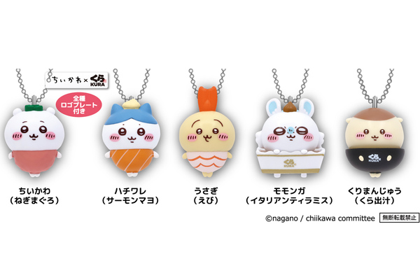 フィギュア、缶バッジ、マグネットシートといった景品は、ちいかわたちがくら寿司の商品「ねぎまぐろ」や「イタリアンティラミス」「くら出汁」などに変身した限定デザインです。