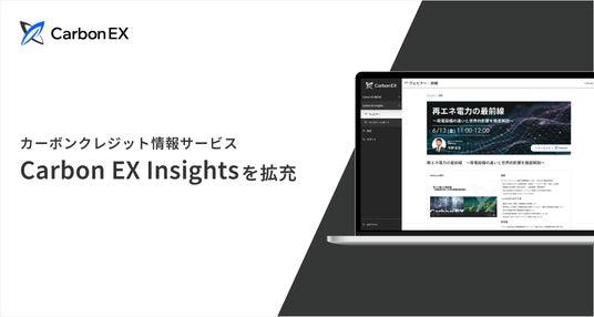 「Carbon EX」は、信頼性の高い、国内外のさまざまなカーボンクレジットを24時間365日閲覧・購入可能なプラットフォームであり、クレジット創出から購買支援までを一気通貫でサポートします。今回、新たに拡充した「Carbon EX Insights」機能では、最新のカーボンクレジットの情報を、レポートやウェビナー形式でわかりやすく提供します。企業は、複雑性の高いカーボンクレジットの情報収集や比較検討の負荷を削減することができ、カーボンクレジットの最適な調達が可能となります。