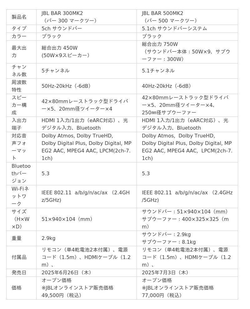 ハーマンインターナショナル株式会社(本社:東京都千代田区、代表取締役:桑原拓磨)は、アメリカ カリフォルニア発祥の世界最大級のオーディオブランドであり、日本においてワイヤレススピーカー7年連続販売台数No.1※1に輝く「JBL」から、圧倒的没入サウンド体験を実現し、オーディオビジュアル専門誌のベストバイ企画でサウンバー部門1位を受賞するなど高評価をいただいたサウンドバー「JBL BAR 300」の最新モデル「JBL BAR 300MK2(バー 300マークツー)」と、サブウーファーを付属した上位モデル「JBL BAR 500MK2(バー 500マークツー)」の2製品を2025年6月26日(木)より順次発売いたします。