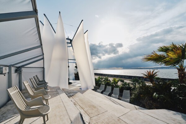 自然光を活かし、音・光・香りで共感覚を刺激するデザイン。建築面積43m²、延べ面積160.83m²。 設計・施工は、太陽工業、TSP太陽、KOMPASが共同で担当。完全予約制で高い人気を集めている。