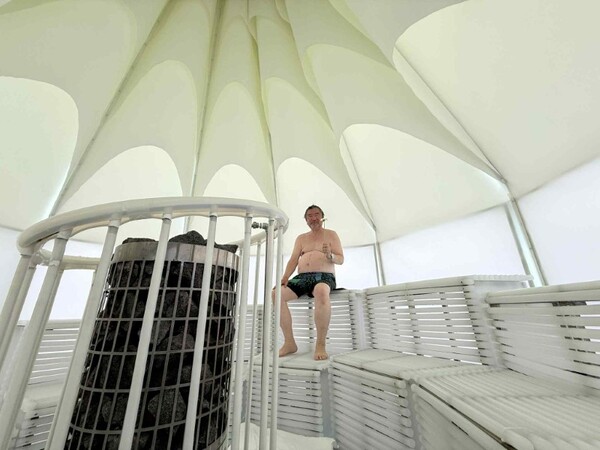 水風呂は3Dプリンターで作られたユニークな設計になっている(水温は16度)。頭まで潜れる仕様で、潜ると「仕掛け」として特別な音響効果が聞こえる。これは万博のテーマ「いのち輝く未来社会のデザイン」に合わせ、自然との一体感を演出する要素。何が聞こえるかは実際に体験してほしい。他のサウナ施設では珍しい潜水可能な水風呂で、参加者に新しい体験を提供してくれる。
