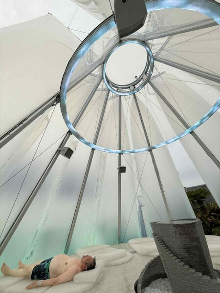 ここは長居はできず、ラウンジ室へ。めっちゃ気持ちのいいメッシュ状のマットに寝転がり、同じメッシュの枕でリラックス。途中で水をかけてもらうのが不思議な感覚。