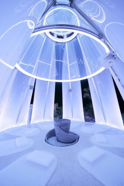 太陽のつぼみは、KOMPASの小室舞氏による意匠設計でできている。自然光を透過するETFEフィルムはフッ素樹脂をフィルム状に圧延した高機能フッ素樹脂のことで、この膜材に覆われた空間の中で、期間中におよそ1万5000人が水着でサウナを楽しめる計画だ。