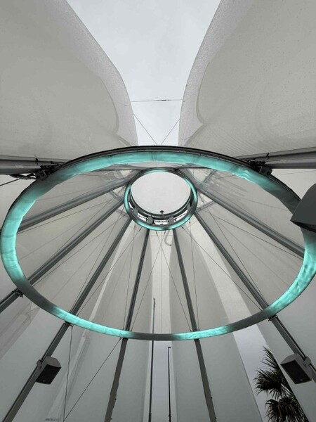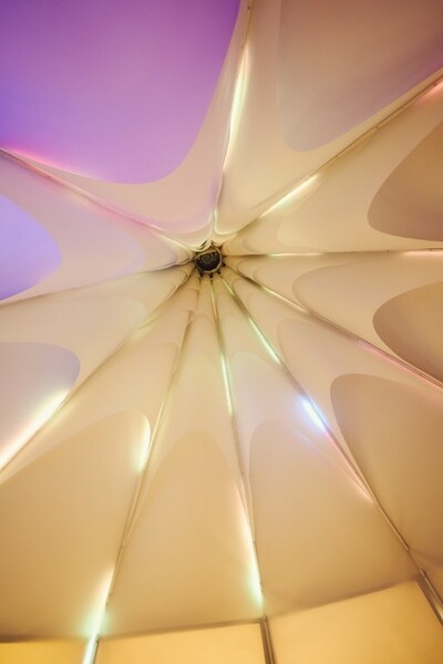 「太陽のつぼみ」の躯体は、最小限のアルミフレームとETFEフィルムと空気だけで構成されたテトラ形状のユニットによる、これまでにない膜建築。最小限の部材で最大限の空気のボリュームを包みこみ、軽量ながらも安定性や断熱性を兼ね備えた、膜ならではの柔らかなデザインを実現している。