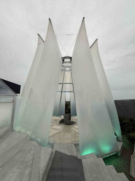 万博サウナ「太陽のつぼみ」は、太陽工業がシルバーパートナーとして協賛する初のプロジェクト。ETFE膜を使用したテトラ形状のサウナ棟、水風呂棟、ラウンジ棟で構成されている。