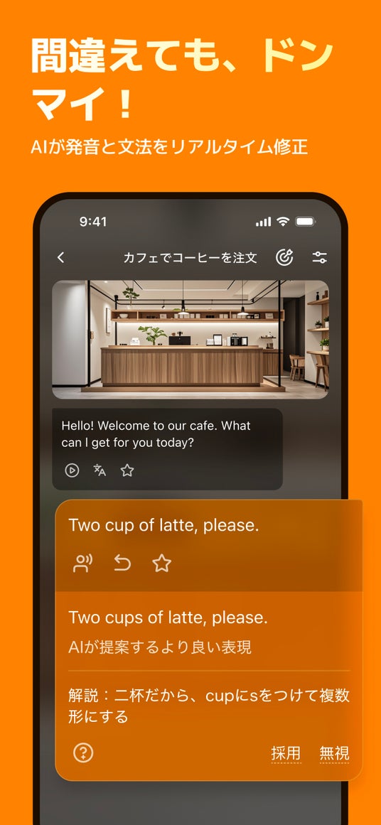- 日本語で話してもOK。AIが英語に翻訳し、あなたのリピート練習をしっかりサポート。