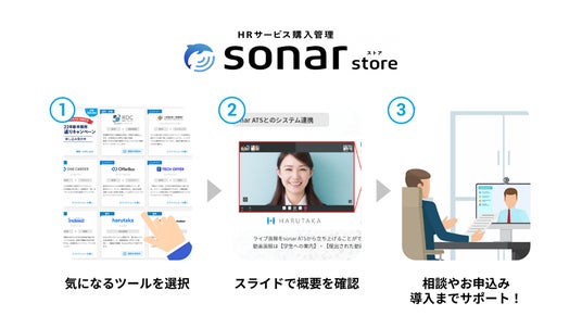 「sonar ATS」では、連携している各種HRサービスの検討・導入支援サービス「sonar store」を提供しています。サービスの比較検討や導入コストを軽減し、より簡単に自社に最適なHRサービスをご利用いただけるよう、「sonar ATS」と連携する各種HRサービスの情報収集から、導入(sonar ATSとのシステム連携)までをフルサポートしています。