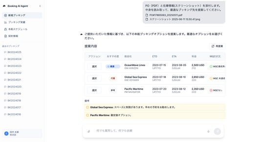 荷主企業の物流担当者は、AIからの提案内容をチャット上で確認し、そのまま「承認」を選ぶだけで、後続のブッキング処理まで自動的に連携されます。入力や転記の手間を省き、迅速な対応が可能になります。