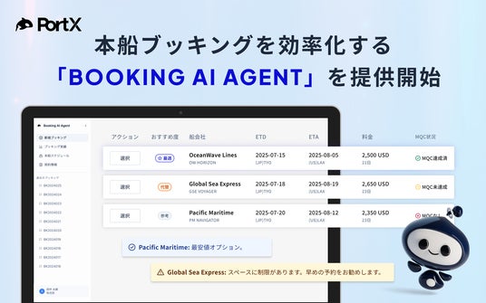 2025年6月17日、株式会社PortX(本社:東京都新宿区、代表取締役CEO 石田寛成、以下「PortX」)は、荷主企業を対象として、本船ブッキング業務を自動化する「Booking AI Agent」(以下「本サービス」)のβ版をリリースいたしました。