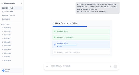 事前に登録された本船スケジュール、契約運賃・MQC・ブッキング実績などの情報をもとに、依頼内容に対して最適な船会社をAIが選定。到着日・コスト・MQC消化率などを比較しながら、複数の選択肢とその選定理由を提示します。