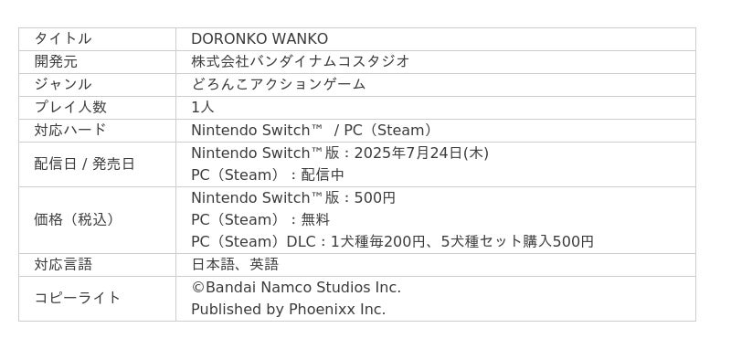 株式会社Phoenixx(フィーニックス)(東京都武蔵野市、代表取締役社長:坂本 和則)と、株式会社バンダイナムコスタジオ(東京都江東区、代表取締役社長:内山 大輔)は、インディーゲームレーベル「GYAAR Studio(ギャースタジオ)」によりSteam版が開発された『DORONKO WANKO』について、2025年7月24日(木)にNintendo Switch(TM) 版の配信が決定いたしましたことをお知らせいたします。Nintendo Switch(TM) 版に合わせ、新たに5つの犬種が登場します。Steam版に向けても同日よりDLCとして配信予定です。