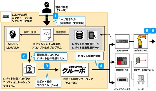 (1)ユーザーからの自然言語と画像入力ユーザーは、たとえば「青い電線をピッキングして横に置いてください」といった日本語による作業指示を与えます。