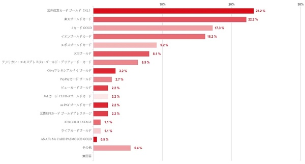 実際にユーザーが持っているゴールドカードの人気ランキングでは、三井住友カードゴールド(NL)が23.2%、楽天ゴールドカードが22.2%、dカードGOLDが17.3%と続いた。また、ポイントの貯まりやすさを重視するなら楽天ゴールドカードが29.2%でトップ、サービスの充実度なら三井住友カードゴールド(NL)が23.8%、コスパ重視なら楽天ゴールドカードが30.3%、海外旅行なら三井住友カードゴールド(NL)が24.3%でそれぞれ最多となった。