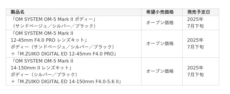 OMデジタルソリューションズ株式会社(代表取締役社長 兼CEO:杉本 繁実)が展開する映像製品ブランド「OM SYSTEM」は、デジタル技術を駆使した新たな写真表現「コンピュテーショナル フォトグラフィ」をはじめとする多彩な撮影機能を備え、小型軽量ながら防塵・防滴仕様を兼ね備えた「マイクロフォーサーズシステム規格」準拠ミラーレス一眼カメラ、「OM SYSTEM OM-5 Mark II」を2025年7月下旬に発売します。