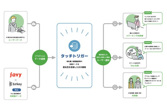 JR東日本が提供する『タッチトリガー』と、ビットキーのスマートロックから取得した入退室履歴をリアルタイムにデータ連携します。これによりユーザーの施設利用を正確に把握し、「来店可能性の高いユーザー層への効果的なアプローチ」「施設内行動パターンの分析による再来店促進」「リアルタイム割引クーポン配信」などを実現します。ビットキーは、favyが運営するシェアオフィス×シェア型フードホール」(アドホック新宿ビル 4階・5階)にスマートロックを始めとする、コネクトプラットフォーム「workhub」を提供しています。オフィスの出入り口や会議室等の施錠・利用ログは「workhub Cloud」を通じてタッチトリガーに連携することで、駅改札のタッチデータと同様に入退室履歴を活用できる仕組みを構築しました。
