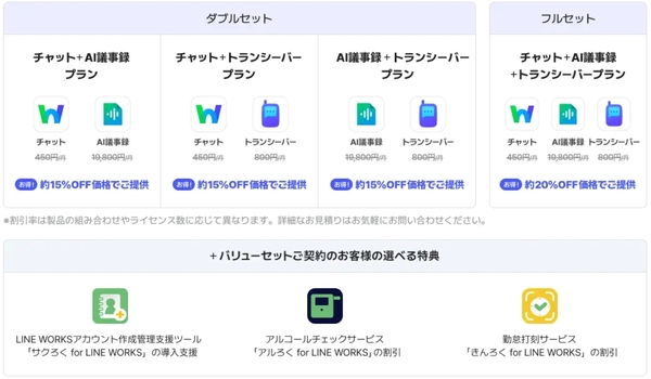 LINE WORKSに加え、トランシーバーアプリ「LINE WORKSラジャー」、AI議事録アプリ「LINE WORKS AiNote」を組み合わせて、最大20%オフで提供するセットプラン。