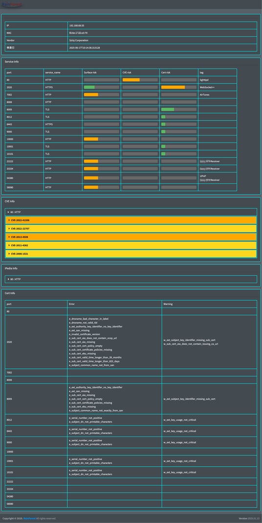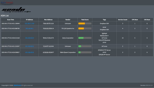 - Webベースの可視化UI(オプション)スキャン結果をグラフや表でリアルタイムに確認可能なダッシュボードを提供。IP・MAC・ベンダー・CVE情報・スキャン時間などを一覧表示し、ネットワークの健全性を一目で把握できます。