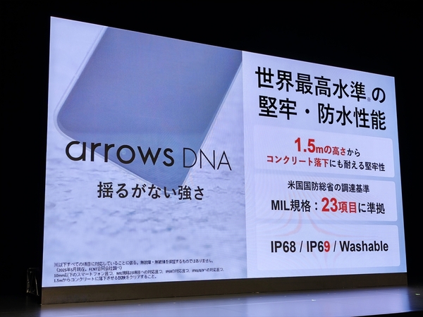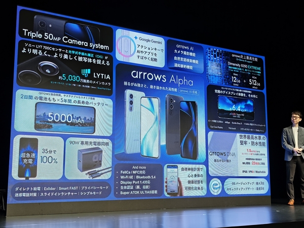 なお、arrows Alphaのスペックはディスプレーが6.4型の有機EL(最大144Hz)、SoCはMediaTek Dimensity 8350 Extreme、メモリー12GB、ストレージ512GB(外部最大2TB)、バッテリー容量は5000mAh(90W対応)。カメラは5030万画素の標準(F1.88、OIS)、4990万画素の超広角(F2.05)の2眼構成。インカメラは4990万画素。ボディーサイズは約72×156×8.8mm、重さは188g。